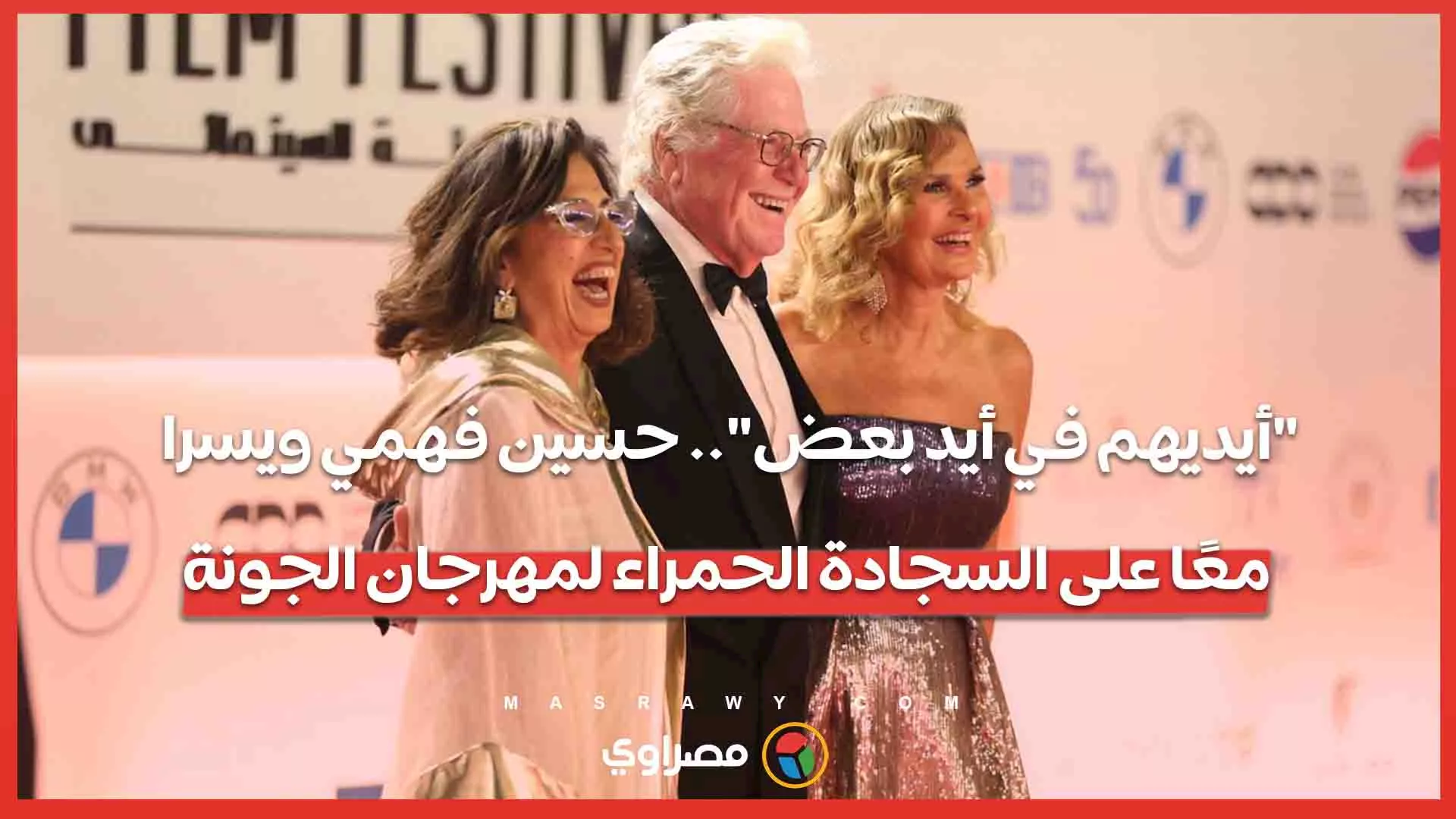 "أيديهم في أيد بعض".. حسين فهمي ويسرا معًا على السجادة الحمراء لمهرجان الجونة
