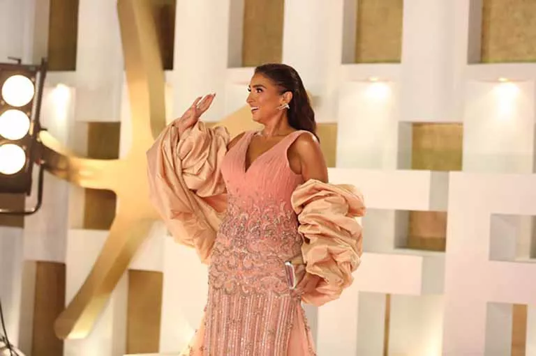 أما الفنانة أسماء جلال فاختارت بدلة باللون الأسود جاءت بتصميم أنيق، في حين لفتت جيهان الشماشرجي الأنظار بفستان أسود لامع.