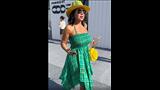 ارتدت فستان حمالة بقصة السبعات من الاسفل، باللون الاخضر وعليه خطوط صفراء، ونسقت معه قبعة باللون الاصفر ومزودة برسوم بنفس لون الفستان، وكلاتش على شكل وردة باللون الأصفر.