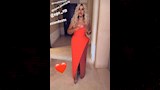 اختارت بوسي فستانا أنيقا باللون الأحمر القاني من تصميم، جاء بقصة ضيقة تبرز قوامها بانسيابية، مع فتحة أمامية أنيقة أضفت لمسة من الجاذبية والرقي على الإطلالة.