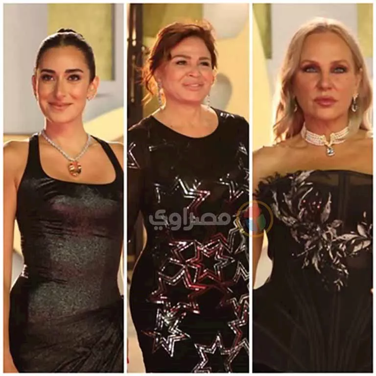 أطلت الفنانة ليلى علوي بفستان أسود طويل مزين بتطريزات لامعة، وبتصميم ذي أكمام واسعة