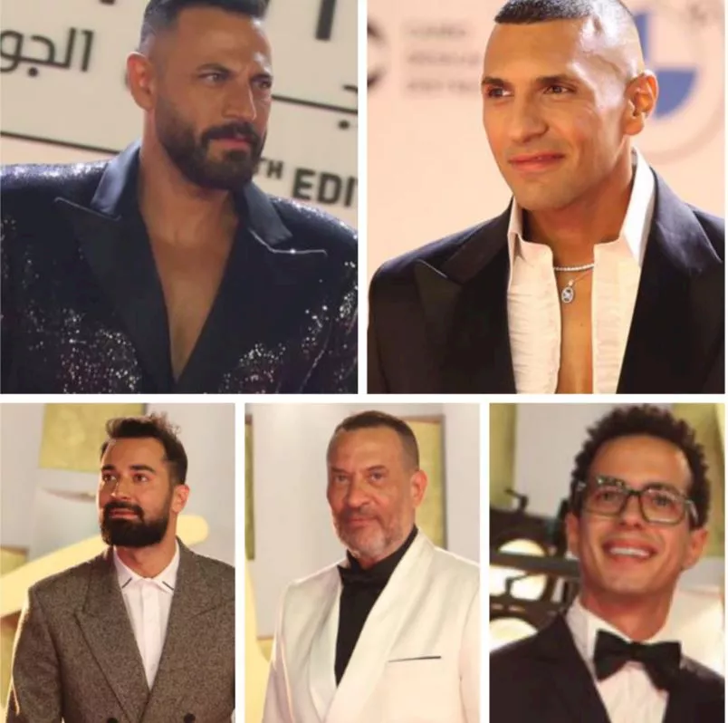 الفنان حسن أبو الروس اختار مظهرا مستوحى من السبعينات، حيث ارتدى بدلة سوداء واسعة الساقين من طراز "شرلستون"، ونسّقها مع حذاء أحمر مدبب جذب أنظار المصورين والحضور على حد سواء.