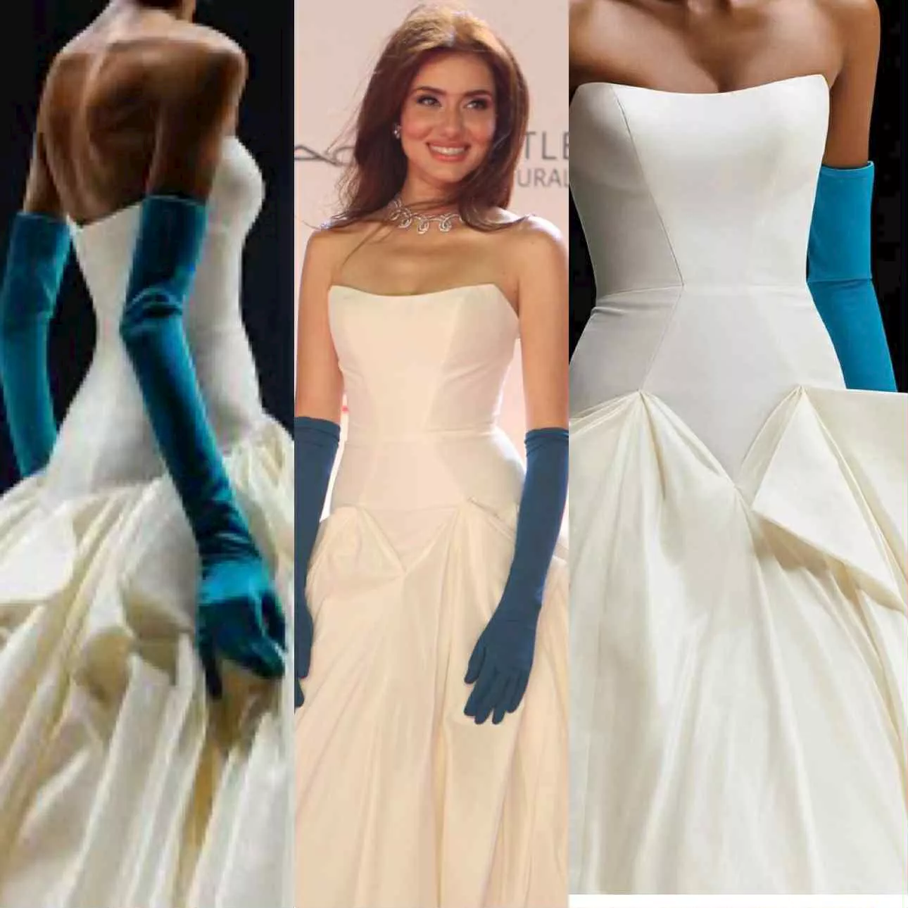الفستان جاء بلون أبيض كريمي يشبه اللؤلؤ، منسوج من حرير وشيفون ناعم. تصميمه العلوي المكشوف الكتفين (strapless) ذو قصة مربعة وطيات، وتنورته بطبقات من التول.