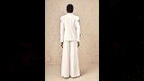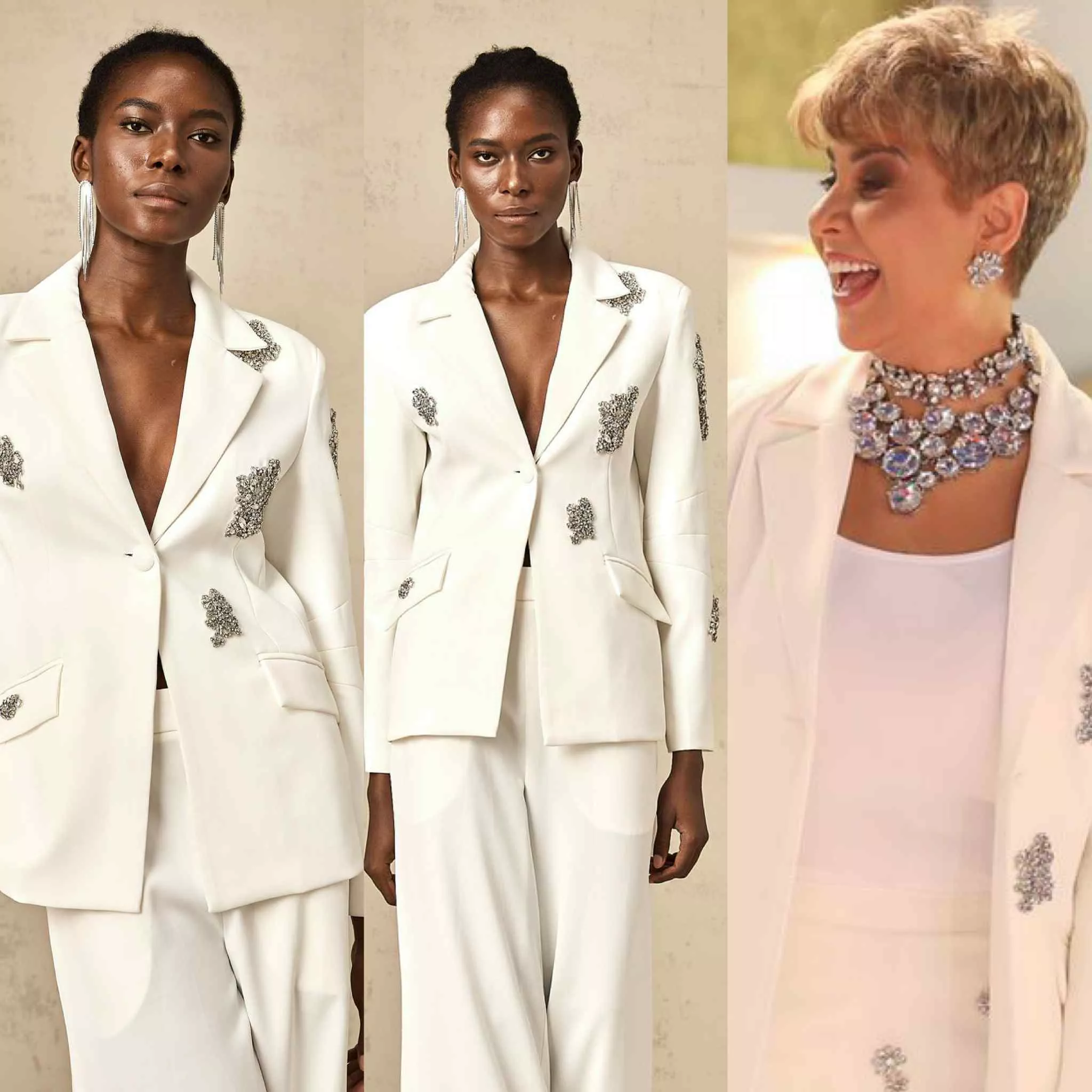 البدلة جاءت بلون أبيض عاجي (Ivory White) من قماش الحرير والكريب الخفيف، تمنح لمعة ناعمة، وجاء الجاكيت بقصة كلاسيكية بياقة Notched Lapel مع تطريز دقيق باللآلئ على الكتفين والياقة، ما أضفى لمسة فخمة.
