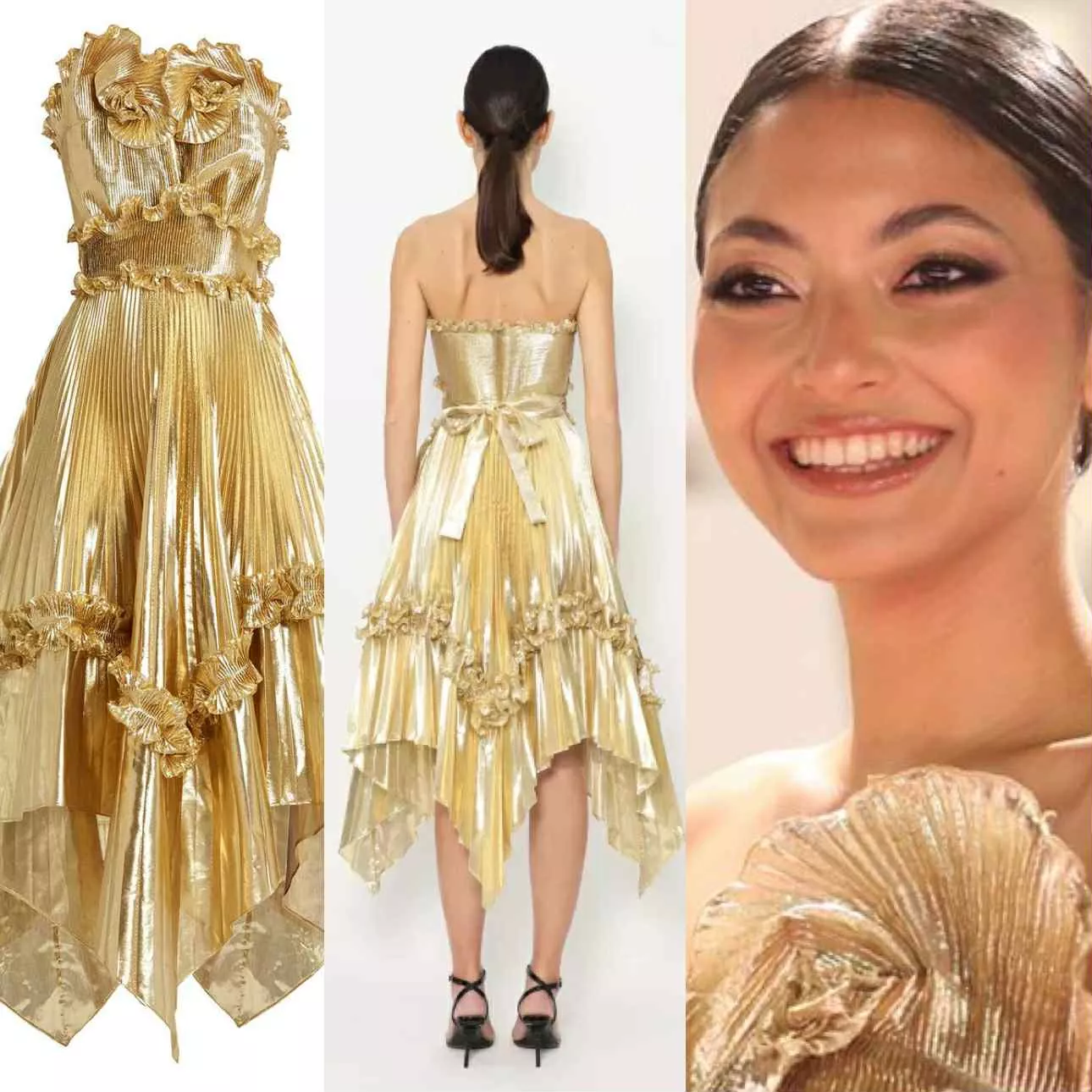 جاء الفستان بتصميم منحوت Sculpted يمنح القماش شكلًا ثلاثي الأبعاد يحاكي حركة الأجنحة الذهبية، مع خامة ميتاليك لامعة تعكس الضوء.