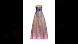 التدرّج اللوني للفستان يبدأ من الأزرق الغامق في الأعلى، مروراً بـ البرتقالي والوردي الفاتح، وصولاً إلى الأحمر الفاتح في الأسفل، ما يمنحه لمسة أشبه بألوان الشفق عند الغروب.