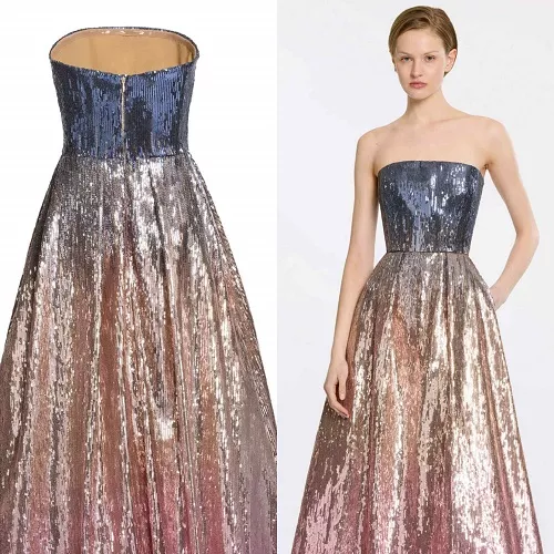 الفستان الذي ارتدته يسرا هو من مجموعة خريف/شتاء 2024، ويحمل اسم Gradient Sequin Flared Dress. يتميز بتصميم سترابلس (strapless) ضيق عند الصدر والخصر، وتنورة منفوشة (flare) متدفقة، مطرزة بالكامل بالسيكوينز اللامع.
