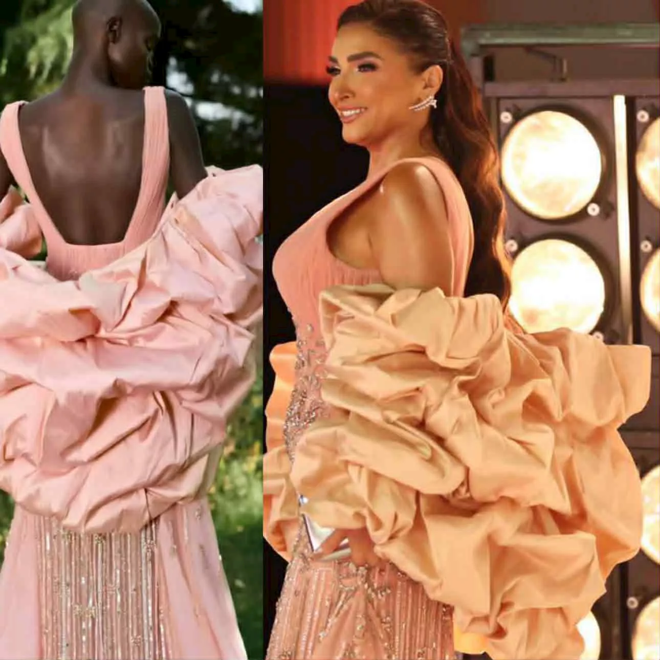 الجزء الخلفي للفستان جاء بظهر مكشوف، مع كشكشة كبيرة من القماش أضفت طابعًا مسرحيًا على الإطلالة.