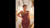 وارتدت ميس فستان طويل وجريء باللون النبيتي مصنوع من الجلد.