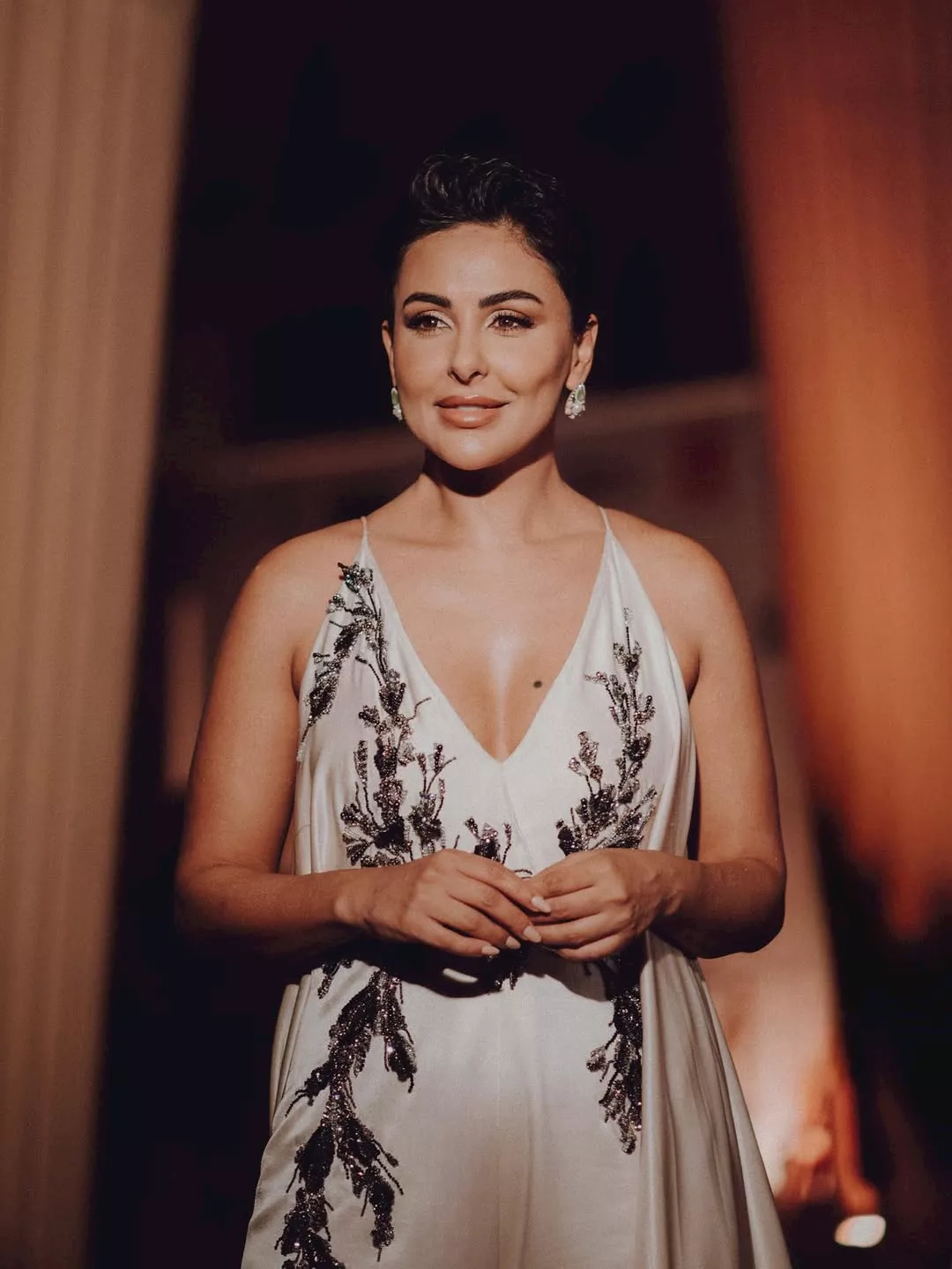 وزينت إطلالتها بمجوهرات مكونة من كوليه وحلق وخاتم.