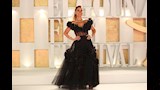 وارتدت هنا فستان طويل باللون الأسود بقصة الأوف شولدر شفاف عند منطقة الخصر.