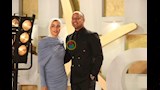 بينما ارتدت زوجته فستانا طويلا باللون البيبي بلو، واعتمدت مكياجا ناعمت إذ وضعت أحمر الشفاه بألوان النيود.