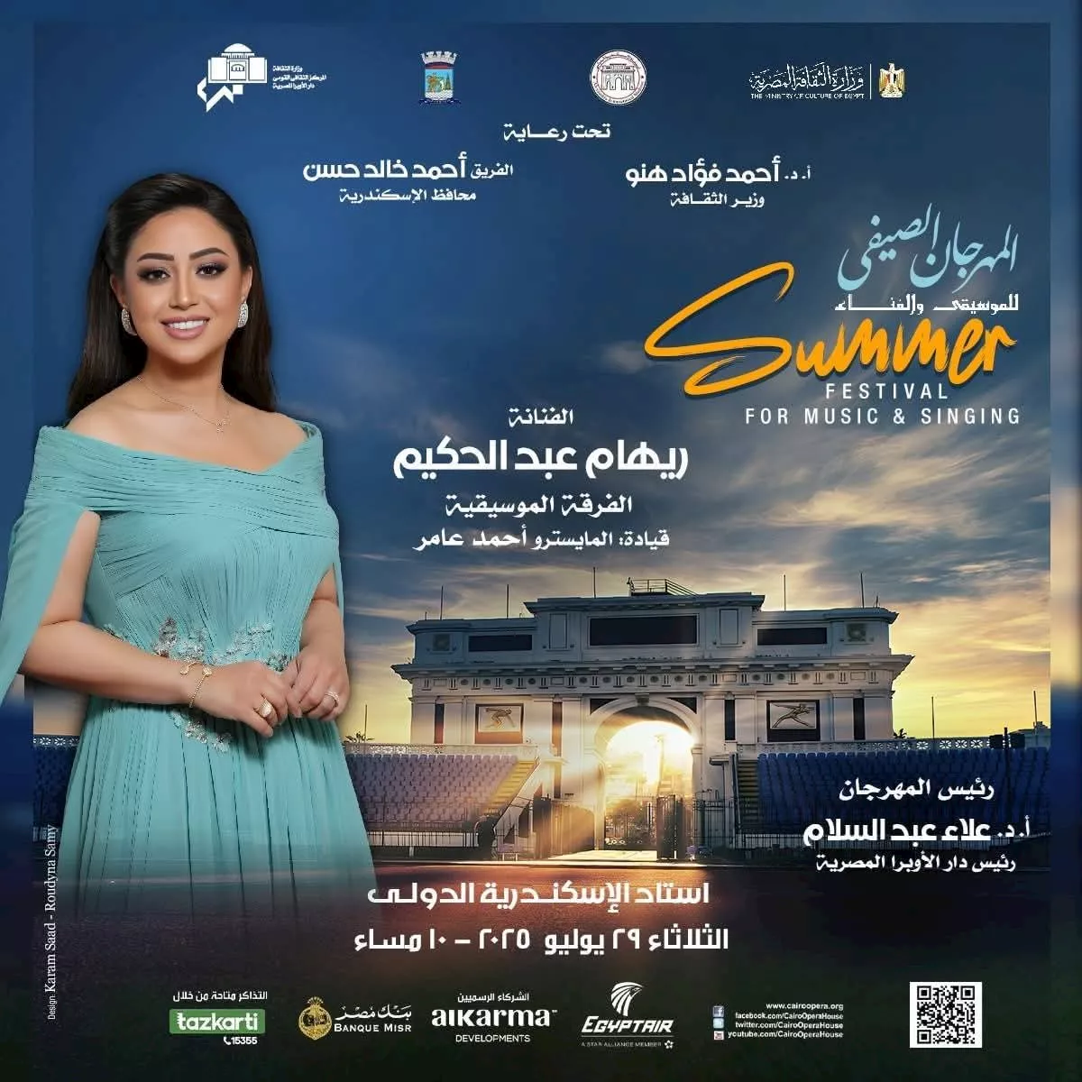 استمرارا لفعاليات صيف الاوبرا 2025 الذي أطلقته وزارة الثقافة ممثلة في دار الأوبرا المصرية برئاسة الدكتور علاء عبدالسلام بالتعاون مع محافظة الإسكندرية، لأول مرة في ستاد الإسكندرية الدولي يُقام في التاسعة مساء الثلاثاء 29 يوليو حفلاً للنجمة ريهام عبدالحكيم بقيادة المايسترو أحمد عامر.