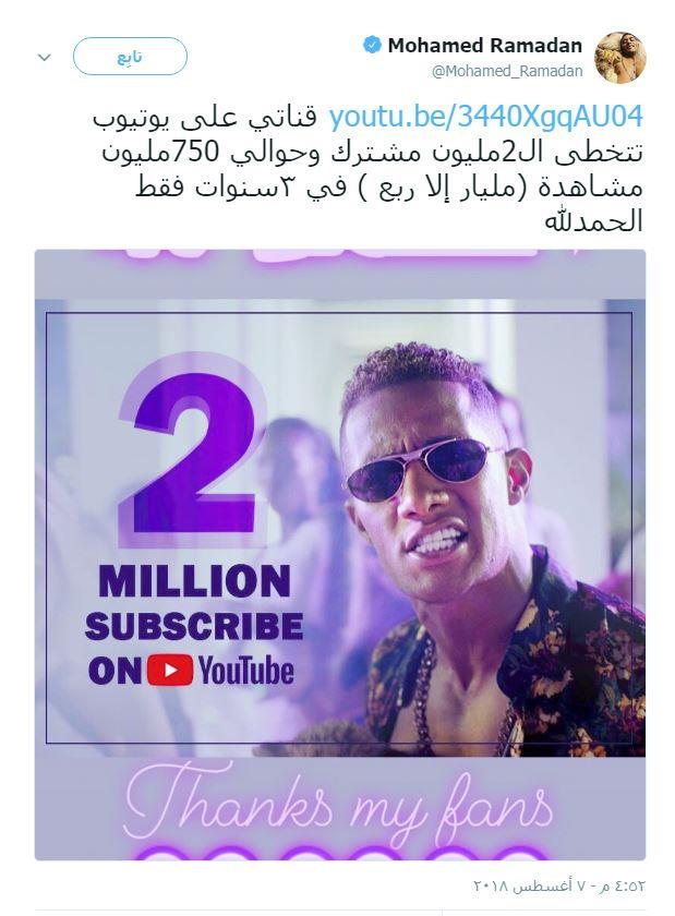 وكتب "رمضان في "تغريده":" قناتي على يوتيوب تتخطى الـ2مليون مشترك وحوالي 750 مليون مشاهدة (مليارا إلا الربع) في ٣ سنوات فقط الحمد لله".
