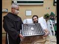 وأهدى الأب بطرس دانيال خلال الزيارة تابلوه بأسماء الله الحسنى، إلى الفنان نضال الشافعي، الذي رحب بالزيارة وظهر خلالها في حالة صحية جيدة.