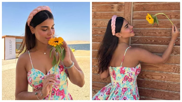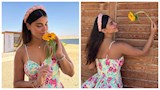 وظهرت نورهان منصور بإطلالة صيفية أنيقة، وهي تحمل وردة على شاطئ البحر