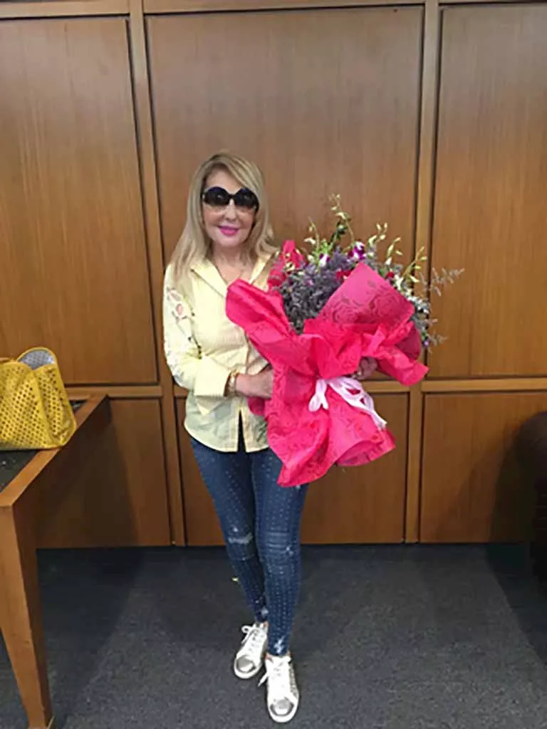 وظهرت الجندي بإطلالة شبابية، ارتدت فيها بنطال جينز وقميصًا أصفر، بينما حملت باقة من الورد.