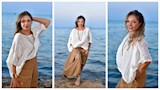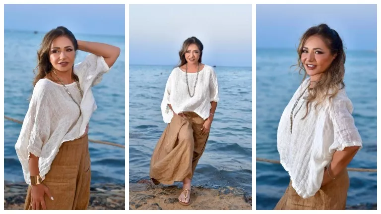 وظهرت ليلى علوي بإطلالة أنيقة أمام البحر، حيث ارتدت جيبة باللون البني مع تيشيرت أبيض.