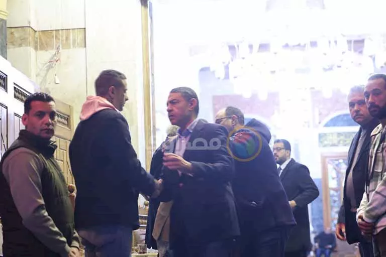 يستقبل الفنان أحمد الفيشاوي المعزين في والدته الفنانة سمية الألفي، في مسجد عمر مكرم.