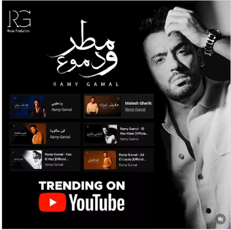 احتفل الفنان رامي جمال بنجاح 6 أغاني من ألبومه الجديد "مطر ودموع" بعد تصدرها التريند على موقع الفيديوهات "يوتيوب".