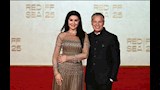 ظهرت أروى مرتدية فستانا أنيقا والتقطت الصور التذكارية مع زوجها على السجادة الحمراء.