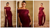 أسماء ارتدت فستانا جذابا وطويلا من اللون الأحمر الداكن.
