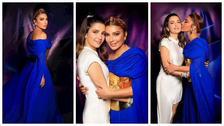 وظهرت أصالة نصري، خلال الحفل، بفستان أزرق طويل وأنيق، مزين باللون الذهبي.