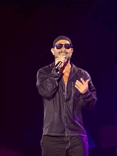 وظهر أحمد سعد في الحفل مرتديًا شورت اسود وقميص بنفس اللون، و"طاقية" سوداء..