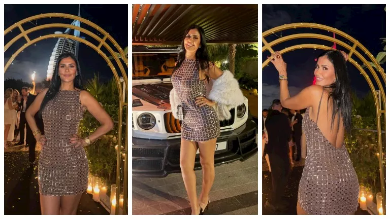 ظهرت ساندي مرتدية فستان قصير بظهر مكشوف خطفت به الأنظار وذلك خلال وجودها في دبي وكتبت: "عام سعيد".