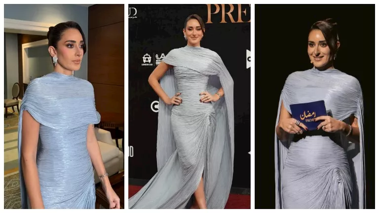 ظهرت أمينة خليل في حفل المتحدة الذي أقيم للإعلان عن مسلسلات رمضان 2026، مرتدية فستان طويل باللون الأزرق الفاتح، مما أعطاها جمال واضح على السجادة الحمراء.