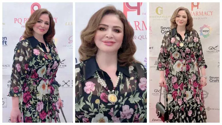 وظهرت إلهام شاهين بفستان طويل مزين بالورود والأزهار جمع بين الأناقة والبساطة، عكس ذوقها المميز في اختيارها للملابس في الحفلات.