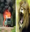 فيديو : أسد يحتجز أسرة داخل سيارة تحترق