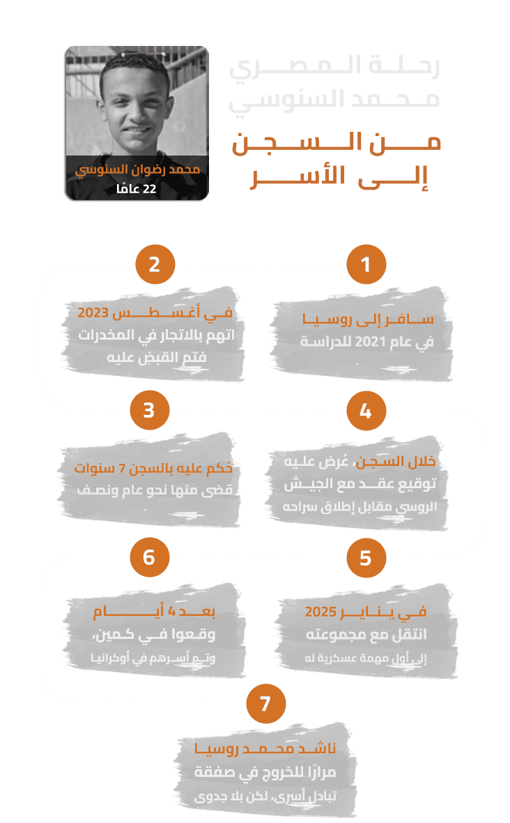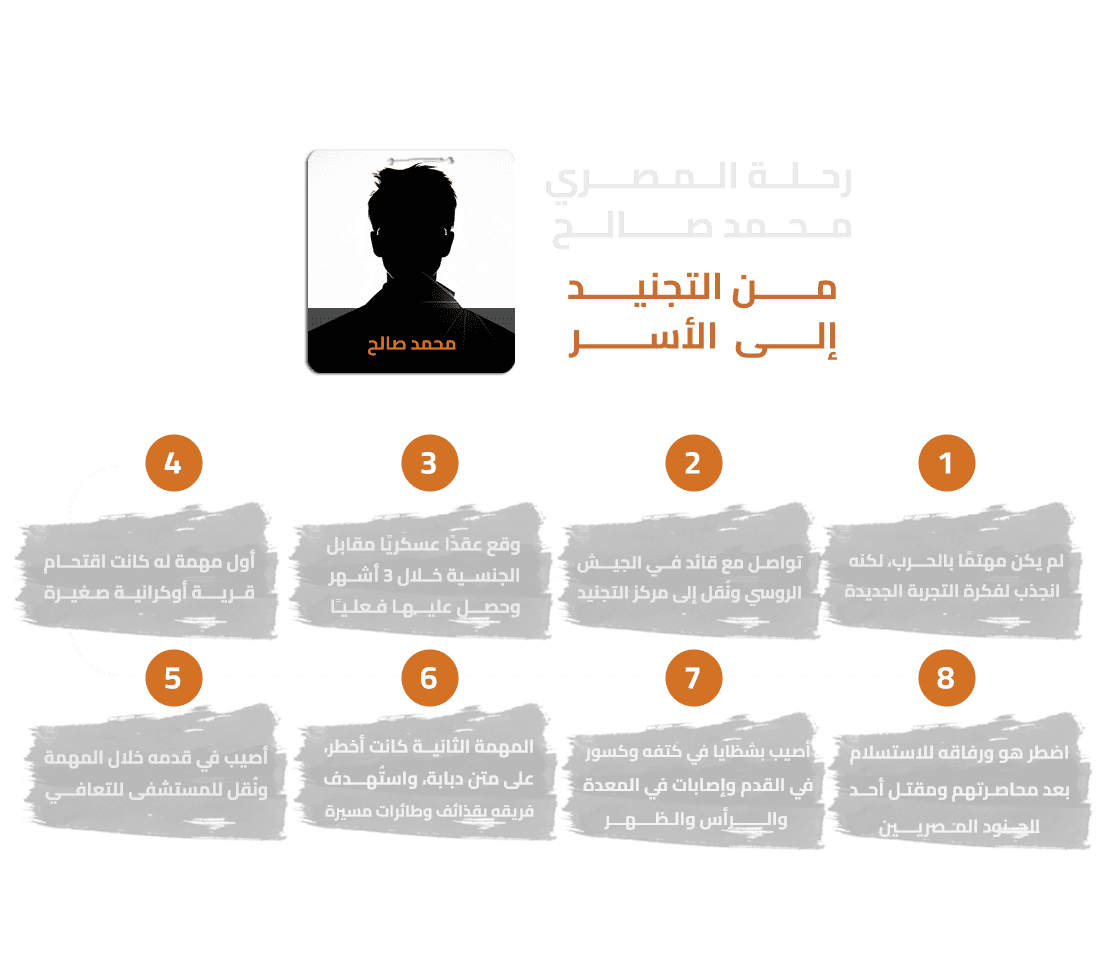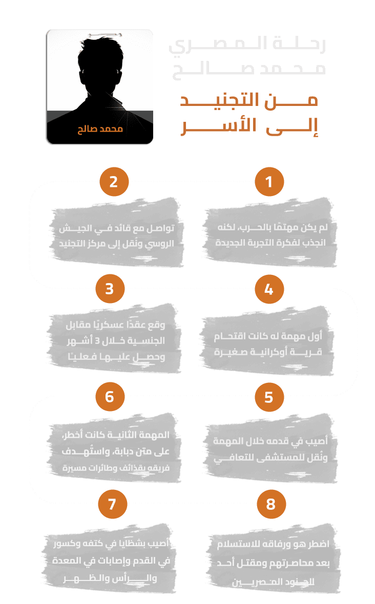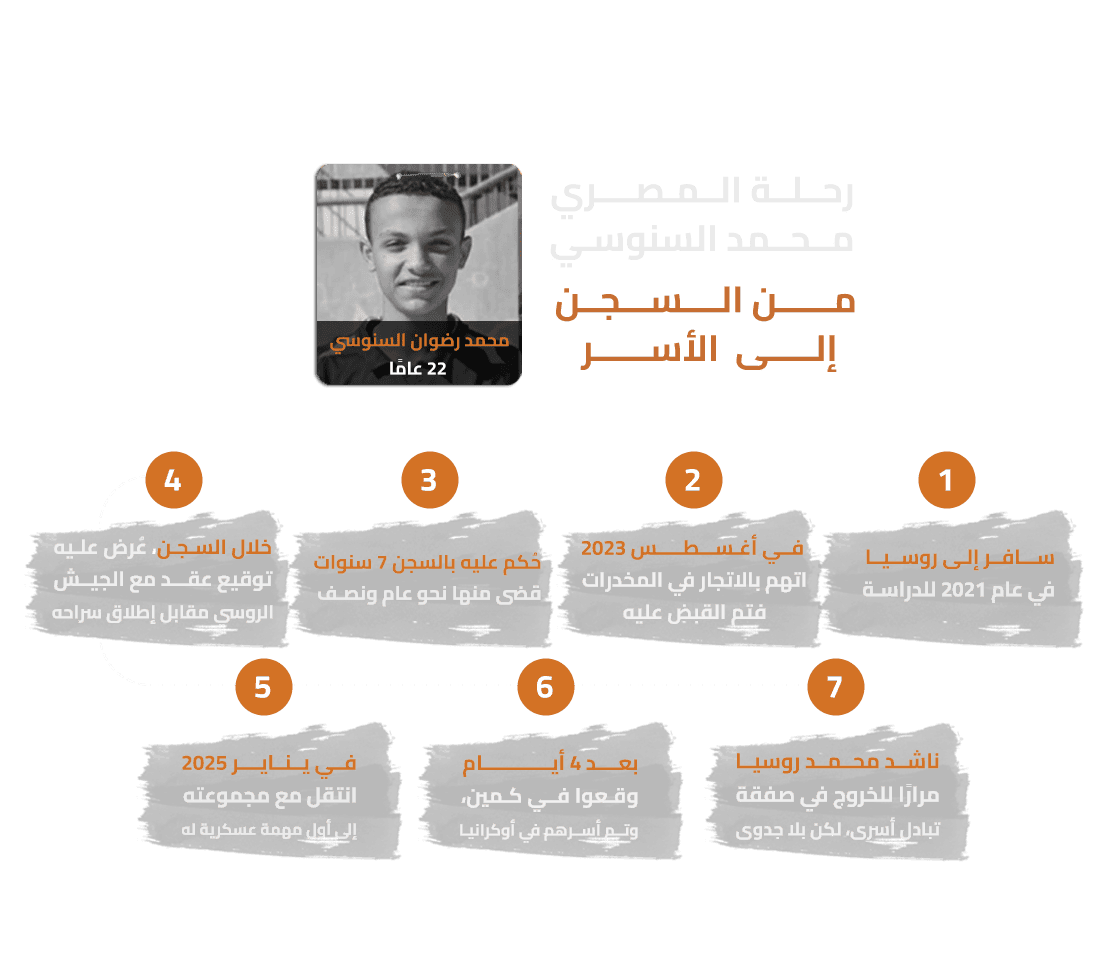 "محمد" الذي سافر إلى روسيا من أجل الدراسة لم يتجاوز الـ 22 عاما، قضى منها عامًا في الأسر الأوكراني وشهرًا ضمن قوات الجيش الروسي، وعامًا ونصف العام في السجن الروسي بعد صدور حكم قضائي ضده بالسجن 7 أعوام، بعد إلقاء القبض عليه أثناء بيعه مواد مخدرات، ويعتبر واحدًا من 50 ألف سجين تم تجنيدهم للقتال في صفوف الجيش الروسي، سقط منهم 35% قتلى، وفقاً لوثائق فاغنر العسكرية التي تحدث عنها يفغيني بريغوجين، رئيس الشركة السابق، في مقابلة مع كونستانتين دولغوف الصحفي الروسي المعروف بدعمه للكرملين.