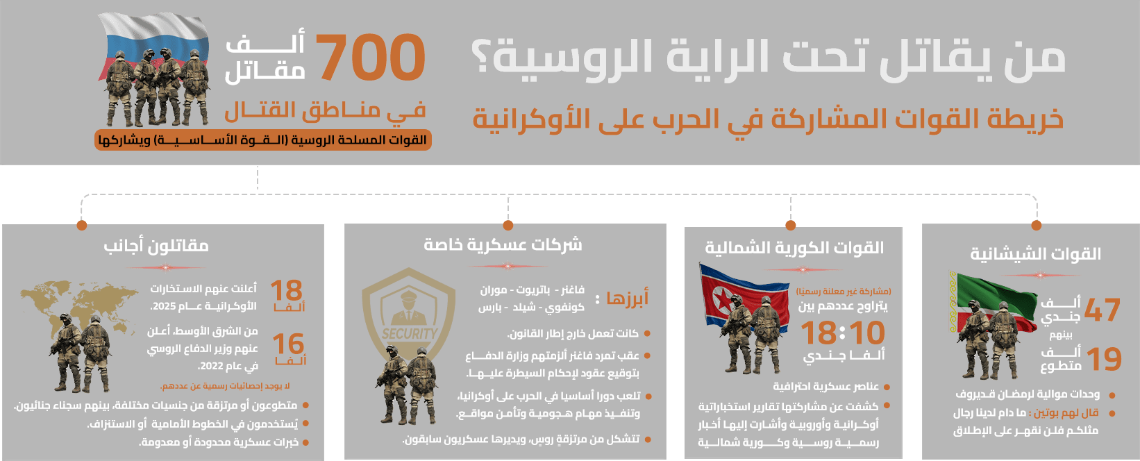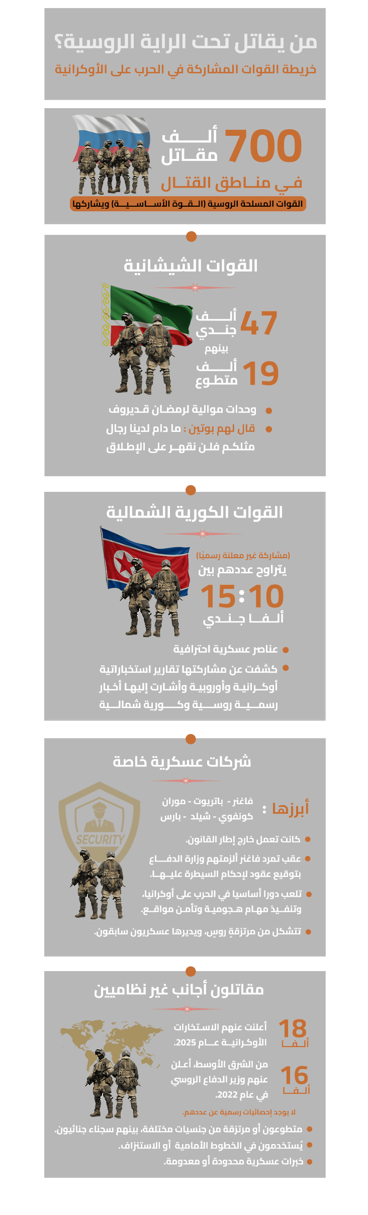 ورغم سَنّ تشريعات جديدة وإجراء تعديلات على قوانين الخدمة العسكرية، من أجل انضمام مزيد من الأجانب للقتال في صفوف الجيش الروسي، لا يوجد إحصاء رسمي عن عدد الأجانب المتعاقدين أو المتطوعين للقتال ضمن صفوف القوات الروسية أو نسبتهم بالجيش، لكن ما رصدته هيئة تنسيق شؤون أسرى الحرب الأوكرانية، يعطي مؤشرًا عن هوية وطبيعة المقاتلين الأجانب في الجيش الروسي؛ حيث رصدت هوية أكثر من 18 ألف أجنبي ليسوا من خلفيات عسكرية يقاتلون مع الروس، من 128 دولة وإقليمًا غير معترف به. ويشمل هذا العدد من جرى التعرف عليهم فقط، بحسب المتخصص الأوكراني في الشؤون العسكرية، دينيس بوبوفيتش، الذي أوضح أنه لا يمكن لهؤلاء التأثير في المسار العام للأعمال القتالية؛ لكنهم يموتون بلا جدوى باعتبارهم "موارد بشرية استهلاكية" يدفع بهم في الصفوف الأمامية، خاصة في وحدات المشاة الهجومية، وسط تجاهل واضح من القادة الروس لمصيرهم.