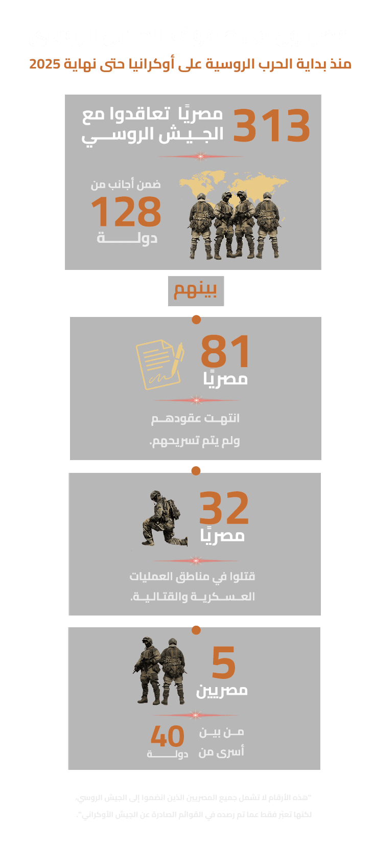 "سالم" الذي انتهت حياته تاركًا زوجة أرملة وطفلين يتيمين، و"سعيد" الذي مازالت والدته وشقيقته تسعيان لمعرفة مصيره، كان ضمن 313 مصريًا أبرموا تعاقدات مع الجيش الروسي، ووردت أسماؤهم في قائمة المقاتلين الأجانب - ضمن التي أعدتها مؤسسة "أريد أن أعيش" التابعة لوزارة الدفاع الأوكرانية- وتضم القائمة من ضمن الأسرى الأجانب الذين قاتلوا مع الروس 5 مصريين، وافق اثنان منهم على التحدث معنا.