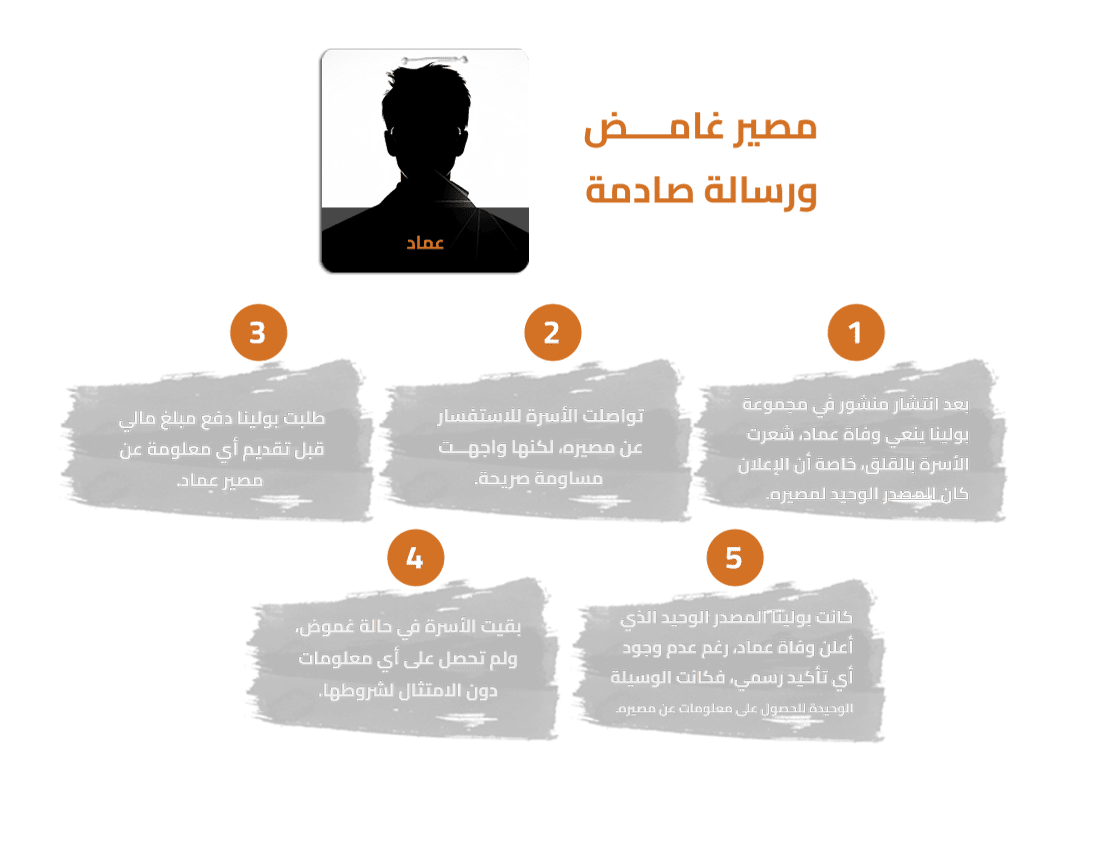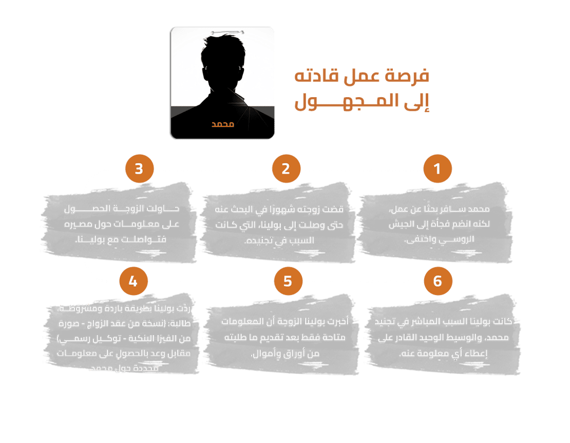 خلال رحلتنا، وثّقنا ثلاث حالات اختلفت أسماؤها وتفاصيل قصصها، لكنها التقت في مصير واحد ومسار متشابه؛ إذ اختفى أحد أفراد كل أسرة بعد انضمامه للجيش الروسي، وحاول ذووهم البحث عن أي خيط يقود لمعرفة مصيرهم. وفي طريق هذا البحث، تواصلوا مع الروسية "بولينا"، التي ساومتهم بدورها مقابل تقديم أي معلومات عن ذويهم.