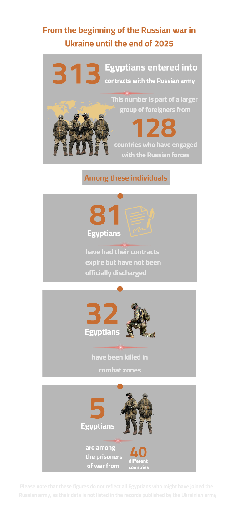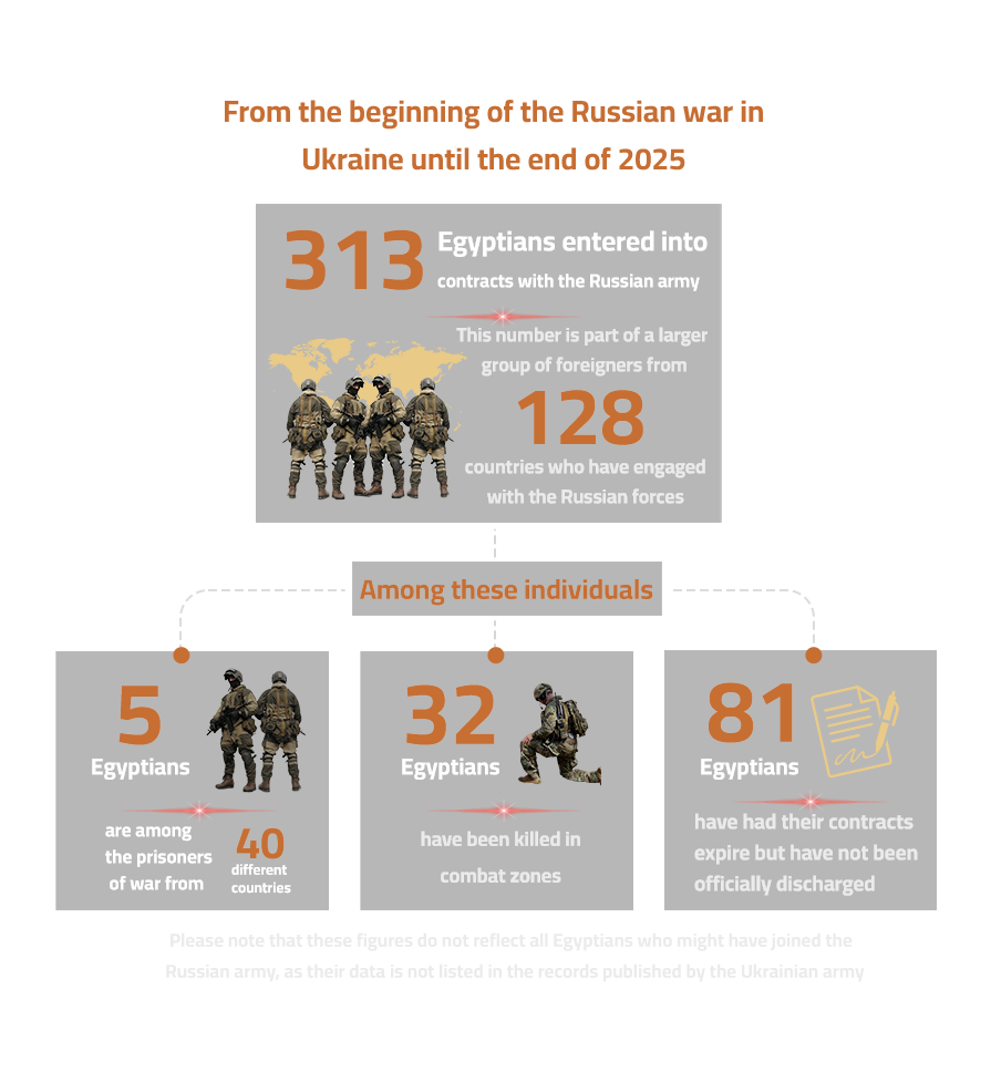 Salem, whose death left behind a widow and two orphaned children, and Saeed, whose fate remains unknown to his mother and sister, are among 313 Egyptians documented to have contracted with the Russian army. Their names appear on a list of foreign combatants compiled by the "I Want to Live" Foundation, an entity affiliated with the Ukrainian Ministry of Defense. This list identifies five Egyptians among foreign prisoners of war who fought alongside Russian forces, two of whom agreed to speak with us.