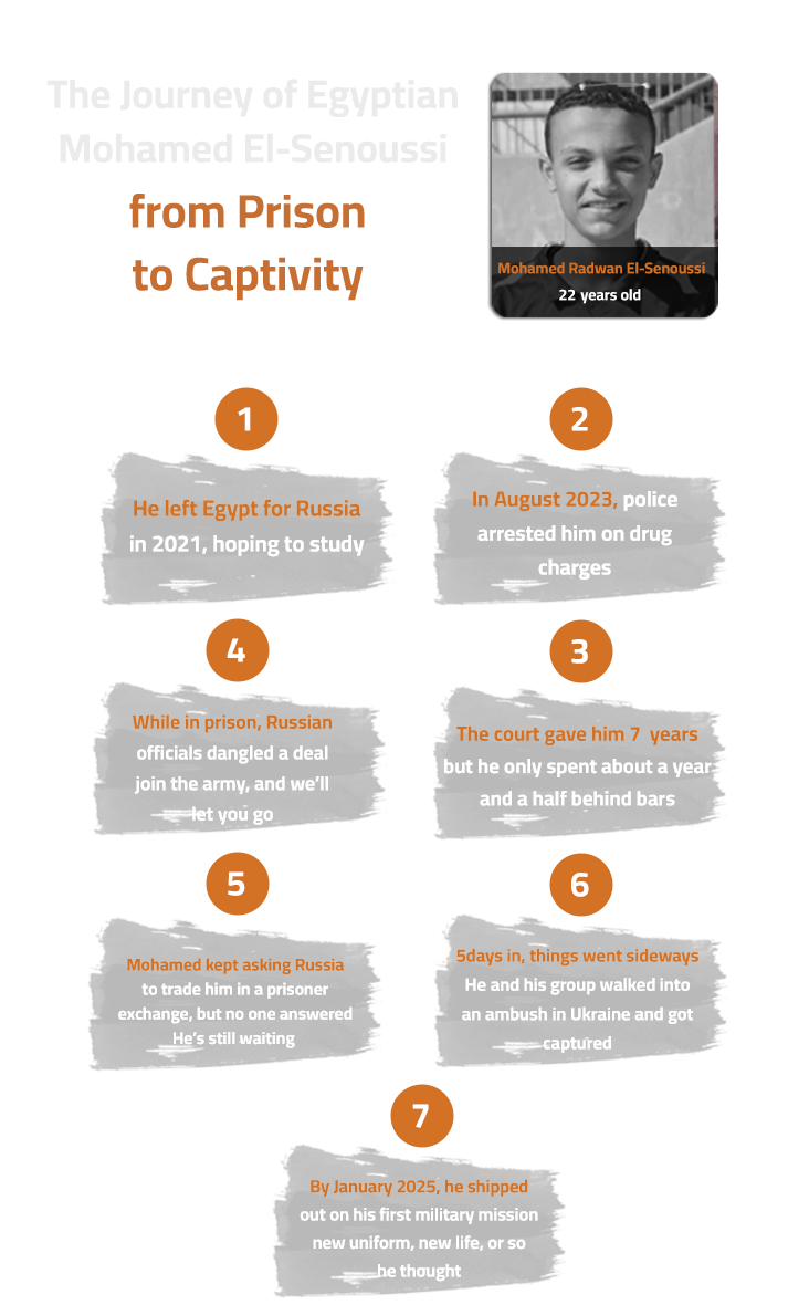 This reality is a source of bewilderment for Mohamed Radwan El-Senousi, one of the five Egyptian nationals currently held captive in Ukraine, who expresses a fervent desire to return to Russia. “There’s nothing—no signs, no news—that says I can go back to Russia,” he says. "Guys like me are not part of any exchange programs. I’m here with Yemenis, Egyptians, Nepalese, and others from various African nations, but we’re not included in any swaps or deals.”