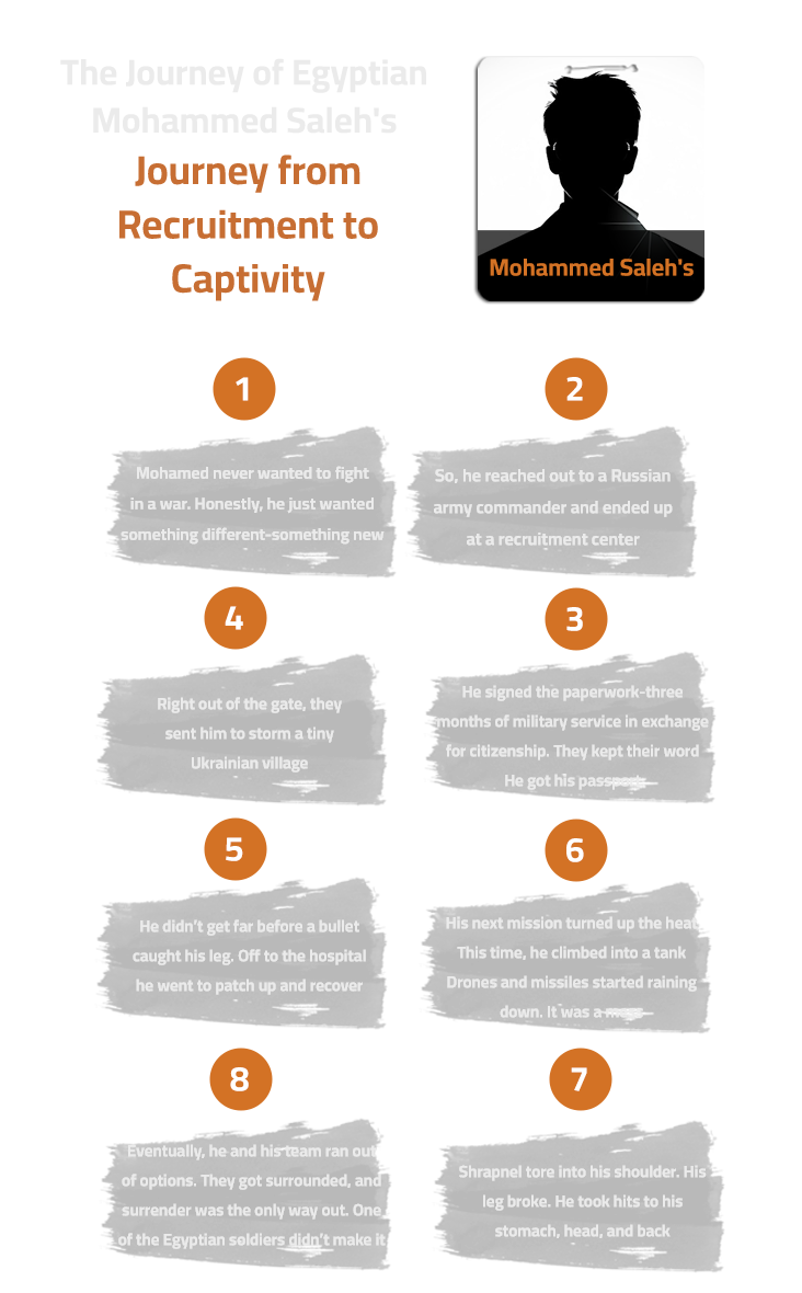 Saleh says that back then, some friends joined up, too. They bragged about big paychecks and their shiny new citizenship. Saleh did not tell his family or ask anybody for advice. He just grabbed the officer’s phone number from a friend and made the call. That call changed everything—a car showed up at his place, took him straight to the recruitment center, and just like that, two months later, he landed in Ukrainian captivity.