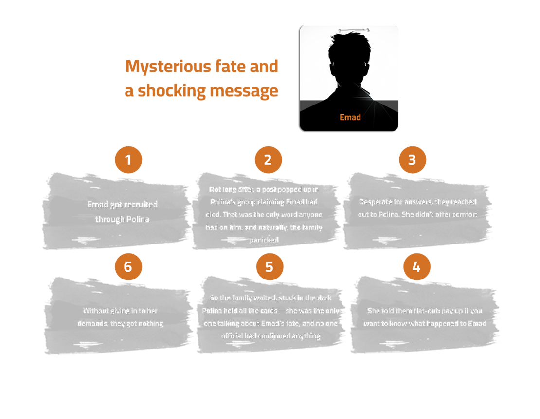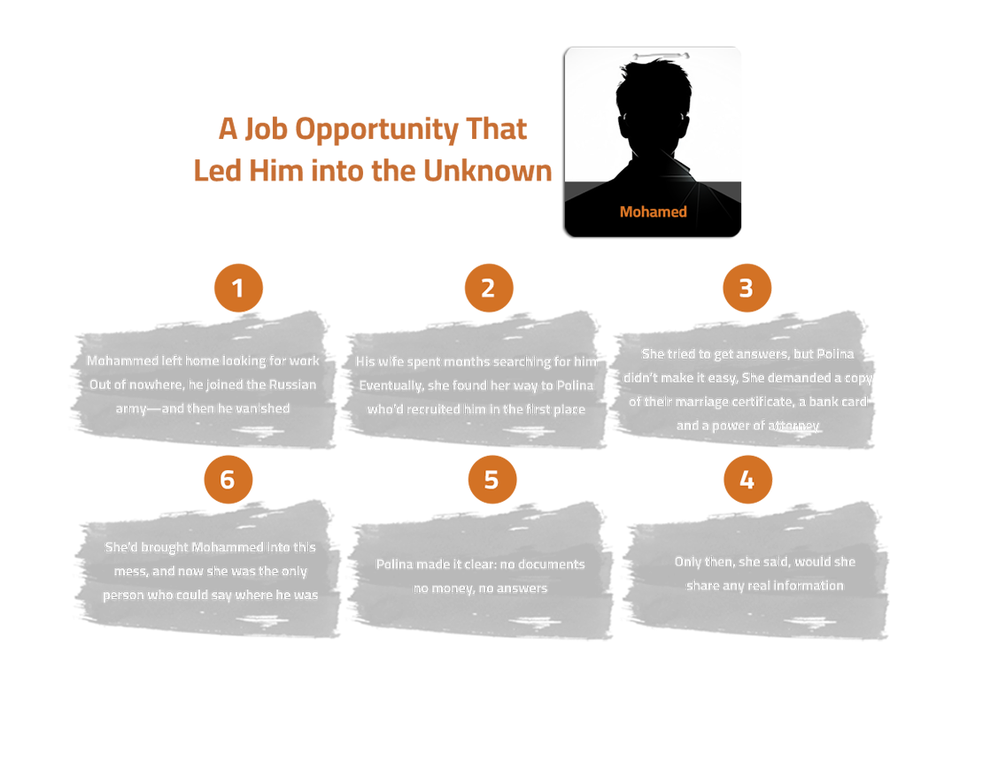 Mustafa really lucked out twice. First, he found out the truth before he ever set foot in Russia. Over there, refusing orders or stepping out of line meant you’d probably end up dead—just like Ahmed Ghoneim. Ahmed spoke out of turn to his Russian commander, and they took him away to some unknown place and executed him. Second, Mustafa actually knew the broker who tried to scam him, a guy who didn’t care who he hurt as long as he got paid. That made it way easier for the security services to track the broker down and question him about what he’d done. Meanwhile, dozens of families haven’t been nearly as lucky. Their sons were recruited directly by Polina, and now they can’t reach her at all. They have no idea what happened to their kids, no way to get any compensation, and they’re left scrambling, trying anything they can think of.