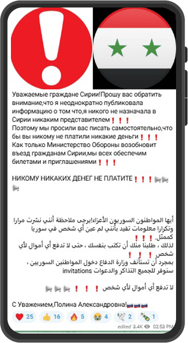 Right before her trip to Egypt in October 2024, Polina Alexandrovna reached out to her followers on her Telegram channel, which she runs on the Russian app. She aimed her messages at Egyptians, Yemenis, and Syrians interested in enlisting in the Russian military. For Egyptians, she sent two messages: one called out seven people by name, telling them to get in touch so she could arrange their travel to Russia. The other message addressed both Egyptians and Yemenis, stressing that they needed to complete certain medical evaluations as a prerequisite before signing up for military service.