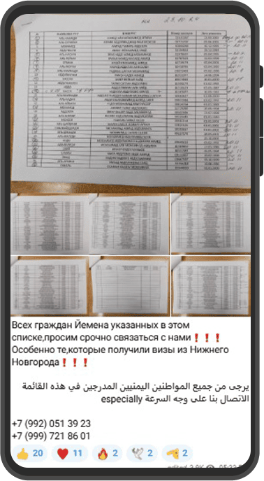 Then she did something odd. She posted photos of 32 Yemeni passports without saying why. Not long after, she shared a list with 202 Yemeni names, urging them all to contact her right away. At the same time, she warned Syrians not to trust anyone who said they spoke for her, whether inside Syria or anywhere else.