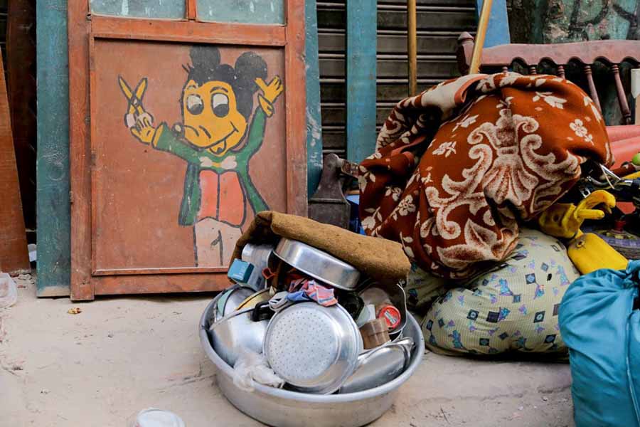 كانت الشمس تعلن انتصاف اليوم، بينما لم يتخذ أي منهم ساترا يحميه، 5 عمال وقفوا كلاعبي الأكروبات على رأس المنزل ذي الأربعة طوابق، يضربون الحوائط أسفلهم بلا كلل، ويتلقون التعليمات من "حميدو" ومعاونيه، الذين ارتكزوا على ثلاثة كراسي خشبية في نهر الشارع، خلا المكان من السكان الأصليين وبقيت مجموعة من الكلاب والقطط وبعض البشر يترجلون.