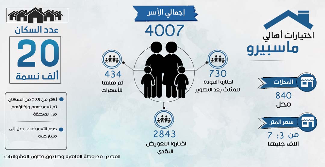 منذ مطلع فبراير الماضي وضعت الحكومة ثلاثة خيارات أمام سكان مثلث ماسبيرو: إما التعويض بمبلغ مالي؛ الغرفة الواحدة ما يوازي 100 ألف جنيه، على حسب مساحة كل شقة وعدد أفراد الأسرة، أو السكن بحي الأسمرات الجديد –تُعطى الشقة هناك مقابل 200 ألف جنيه مجهزة بالكامل، ولا يتم دفع الأقساط إلا بعد السنة الأولى من امتلاكها. واختارت بعض الأسر العودة للمنطقة بعد تطويرها، مقابل الحصول على متوسط للتأجير -40 ألف جنيه، ما يوازي 1200 جنيه شهريا- ثم العودة لماسبيرو بعد ثلاث سنوات حتى يتم تطوير المنطقة وهو ما يُعرف باختيار "البقاء".