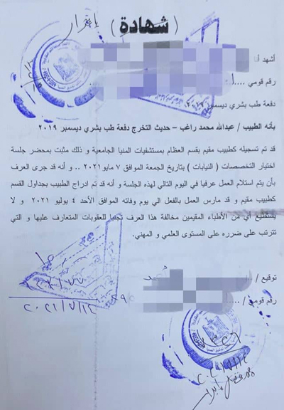 رفضت جامعة المنيا الاعتراف بالفترة التي قضاها الطبيب الراحل عبد الله راغب كطبيب مقيم بالمستشفى، لعدم وجود أوراق تثبت عمله، لكننا وثقنا في هذا التحقيق شهادة زملائه أنه كان يعمل معهم قبل وفاته بدوام كامل.
