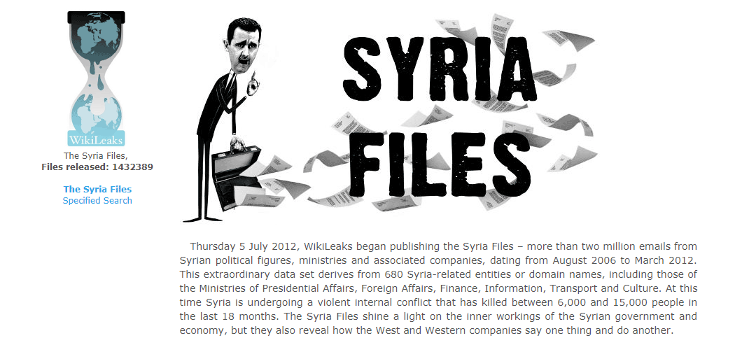 في يوليو 2012، بدأت "ويكيليكس" نشر أكثر من مليوني رسالة إلكترونية، عبارة عن مراسلات ترجع تواريخها للفترة من أغسطس 2008 إلى مارس 2012، بين أجهزة مختلفة في الحكومة السورية منها وزارات شؤون الرئاسة، والشؤون الخارجية، والمالية، والإعلام، والنقل والثقافة، وبين شركات وجهات دولية بينها موقع فيسبوك. وكشف الأخير خلال هذه المراسلات عن تفاصيل أنشطة مستخدميه في سوريا، مثل تسجيل أحدهم الدخول من مكان ما، وأحدهم تلقى طلب صداقة، وآخر تلقى رسالة.