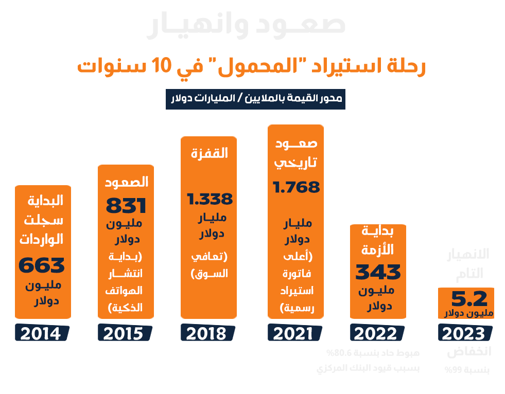 لفهم المشاهد التي تحدث في مطار جدة، علينا العودة قليلاً للوراء.. فقد شهدت السنوات العشر الأخيرة تطوراً لافتاً في استيراد الهواتف المحمولة، وفي مقدمتها هاتف "الآيفون" بمسمياته المختلفة (11، 14، 15، برو، بروماكس، 16، 17). وتباينت فاتورة الاستيراد الرسمية؛ فعند النظر إلى بيانات واردات مصر من الهواتف المحمولة وفقاً للجهاز المركزي للتعبئة العامة والإحصاء، نجد أننا أمام قصة صعود وهبوط دراماتيكية تعكس التحولات في السياسة النقدية والتجارية للدولة، وهي أحد أسباب وصولنا إلى هذه القصة..