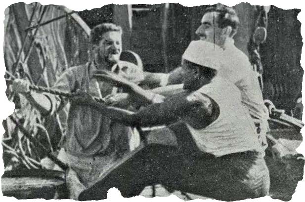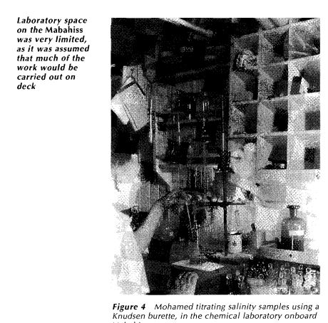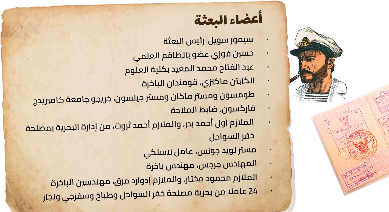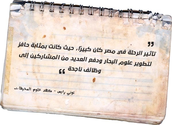 دائمًا ما تكون أولى المحطات هي أصعبها. التوتر ظاهر على الكل سواء الأساتذة المرتدين القمصان المهندمة، أو البحارة عراة الصدر الواضعين "الطاقية" فوق رؤوسهم.. فهي لحظة، يتعرف فيها كل منهم على عمل الآخر. ولا بديل غير أن يمتزج ويتعاون هؤلاء الواقفون على الرافعات ممسكين بالحبال، والآخرون حاملين الأدوات والأجهزة العلمية.