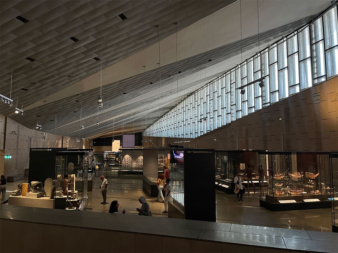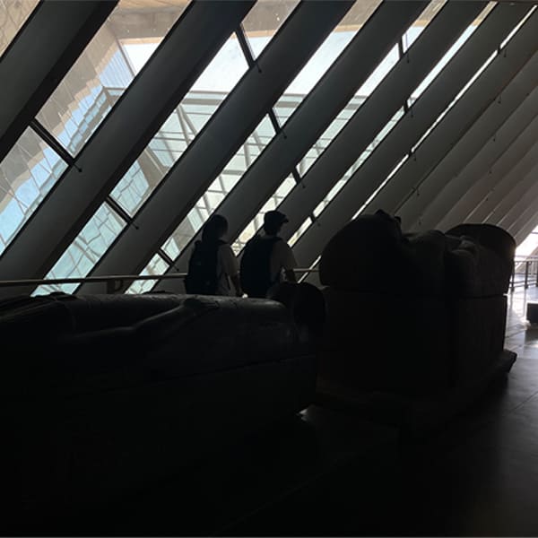 ينتهي درج الزمن هنا، ستخرج من بهو المتحف وعوالمه من أسفل واجهة تضم سبعة أهرام، لدلالة الرقم (7) العقدية والتراثية، مكسوة بالرخام المصري المستخرج من محاجر سيناء على درب المصريين القدماء، وتصل أهرامها المضيئة الأرض بالسماء من خلال الضوء.