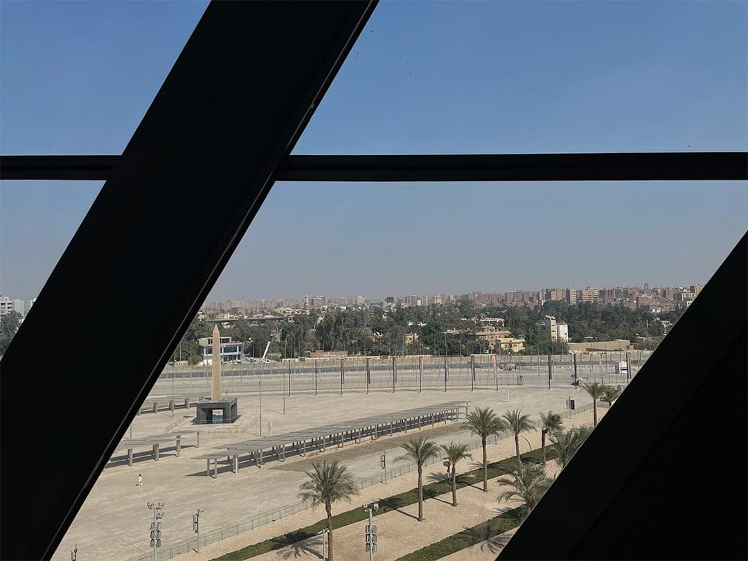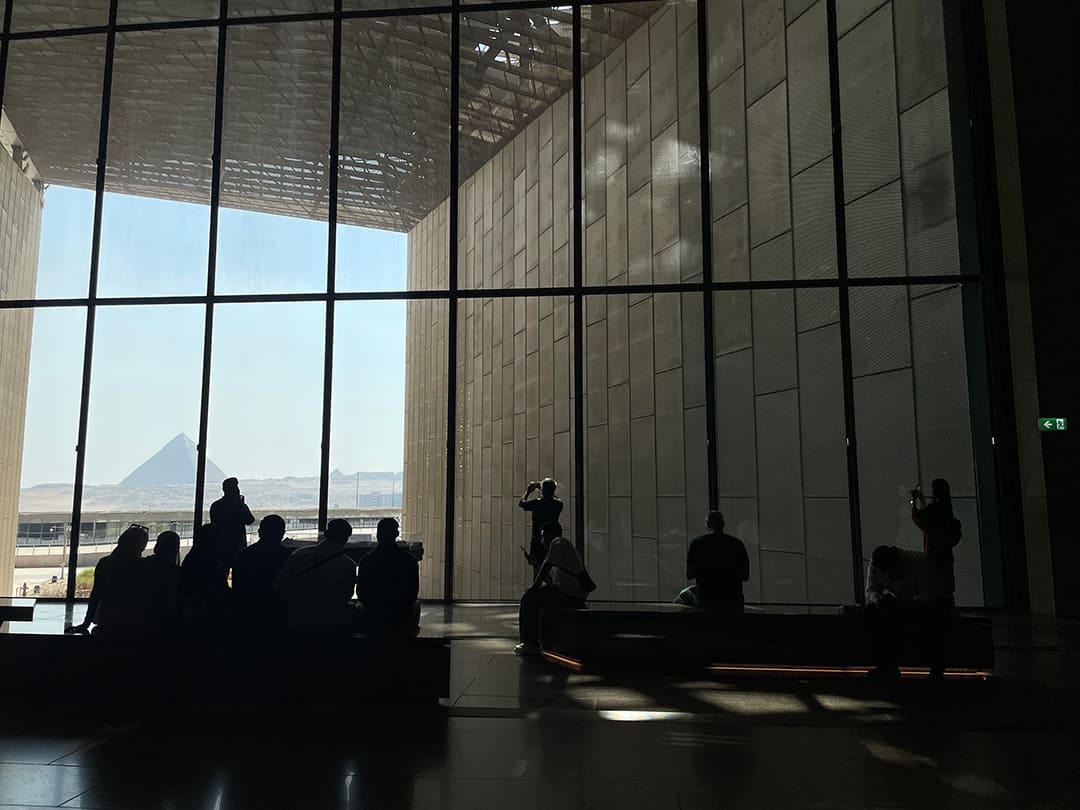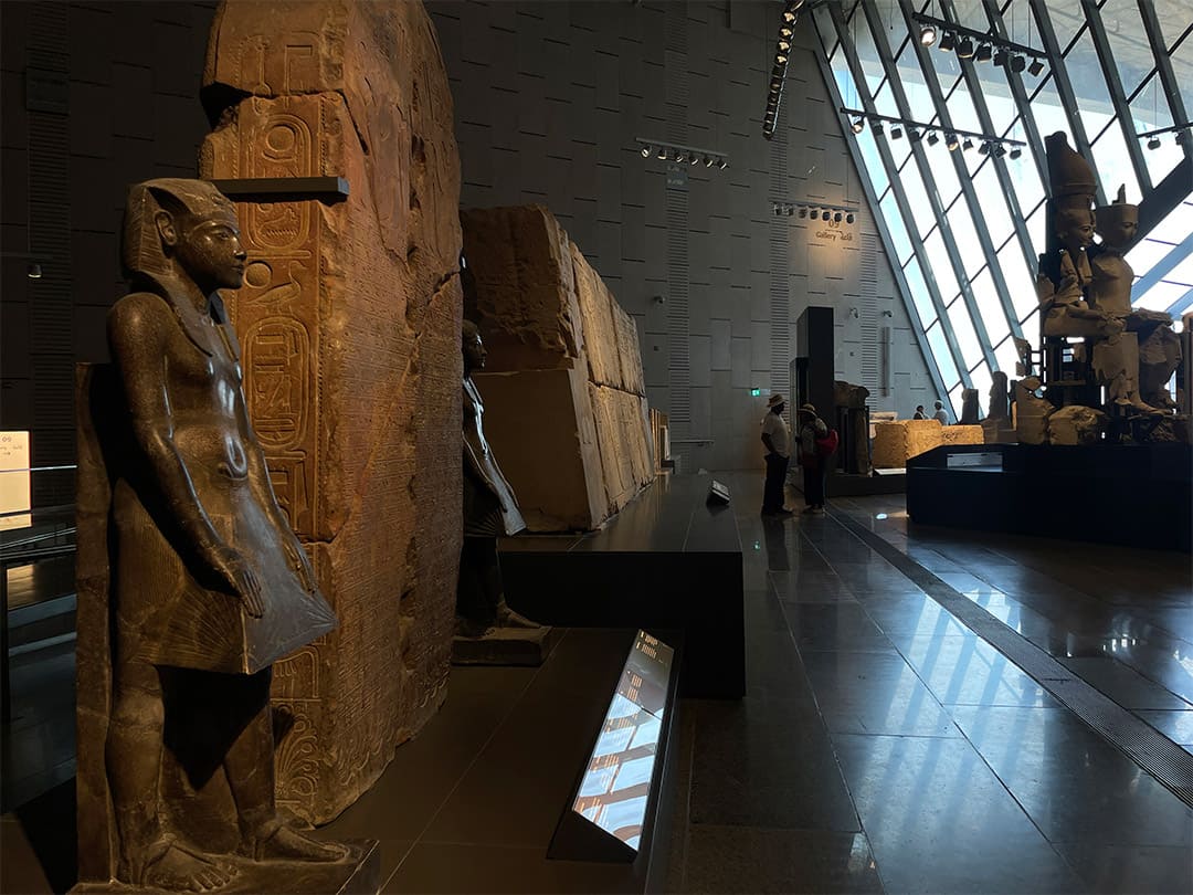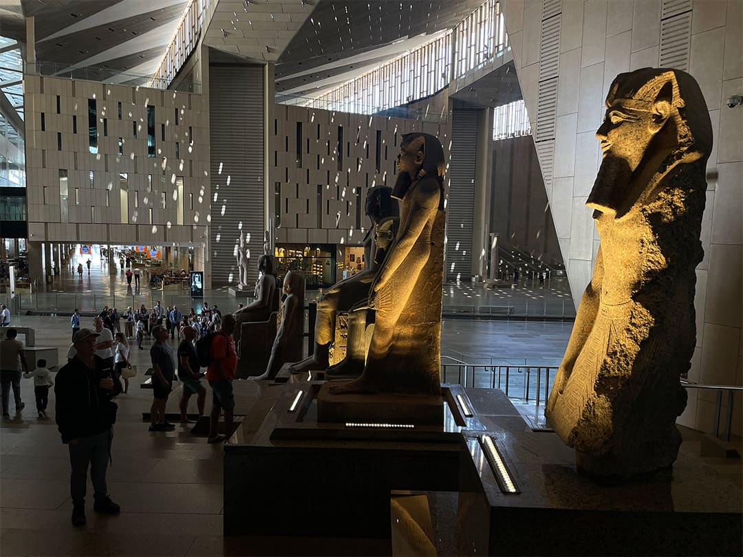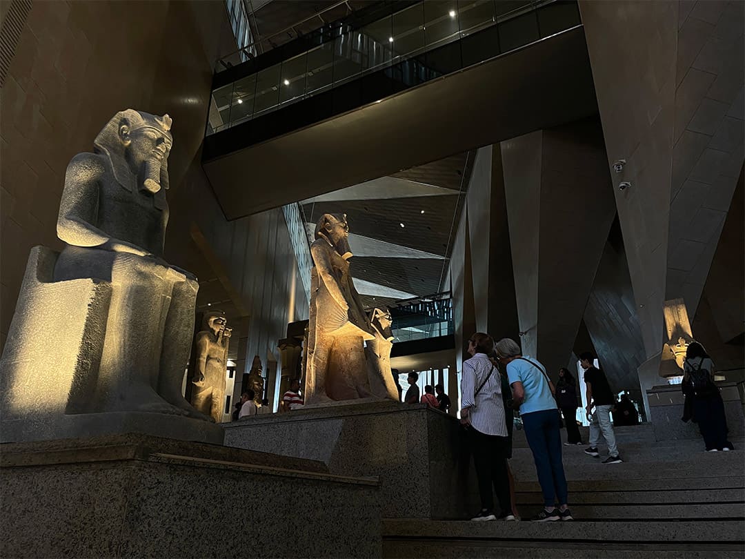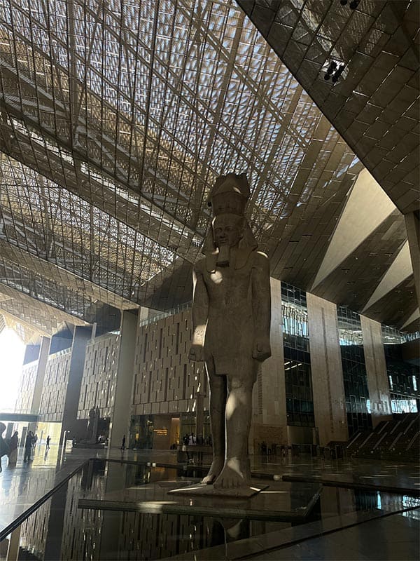 في يوم خريفي مشمس، ترسل الشمس أشعتها على نوافذ المتحف المصري الكبير الزجاجية، تضيء أرجاءه، لتشير بخطوطها إلى فكرة البعث والخلود والنهضة، كما كان الاعتقاد في العالم القديم، فتُظهر وجه الملك رمسيس الثاني، الذي يستقبلك تمثاله قبل صعود الدرج.